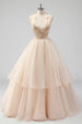 A Linie Gestuftes Champagner Neckholder Ballkleid mit Perlen