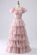 A Linie Hellblaues gestuftes geblümtes langes Ballkleid mit quadratischem Ausschnitt und Rüschen