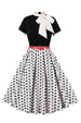 A Linie Schwarzes Polka Dots Kurzarm Kleid aus den 1950er Jahren mit Gürtel