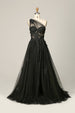 A Linie Eine Schulter Schwarzes langes Ballkleid mit Applikationen