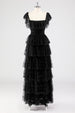 A Linie Schwarzes Gestuftes Ballkleid mit quadratischem Ausschnitt