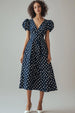 A Linie V-Ausschnitt Marineblaues weißes Polka Dots Kleid mit Puffärmeln