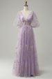 A-Linie V-Ausschnitt Stickerei Lavendel Langes Ballkleid mit kurzen Ärmeln