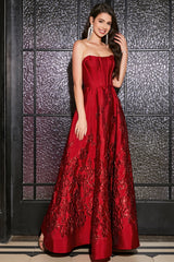 A-Linie Elegantes trägerloses dunkelrotes langes Ballkleid mit 3D-Blumen