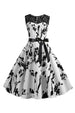 Ärmelloses bedrucktes weißes Rockabilly Kleid mit U-Ausschnitt und Schärpe