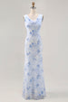 Blaues Blume Wasserfall Ausschnitt Etui Langes Hochzeitsgastkleid