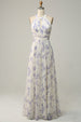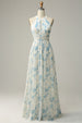 Blaues geblümtes Boho Chiffon Brautjungfernkleid