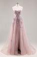 Blaues Trägerloses A-Linie Pailletten Tüll Korsett Langes Ballkleid mit Schlitz