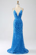Blues Mermaid Spaghetti-Träger Langes Ballkleid mit Pailletten