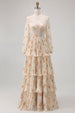 Champagner Geblümtes A-Linie Gestuftes Langärmeliges Brautjungfernkleid