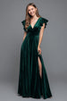 Dunkelgrünes A-Linie Ballkleid aus Samt mit V-Ausschnitt und gerüschten Ärmeln