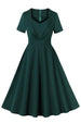 Dunkelgrünes kurzärmeliges Kleid mit Rüschen aus den 1950er Jahren