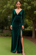 Dunkelgrünes Samt Gerafftes Langärmeliges Festtags-Partykleid mit Schlitz