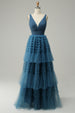 A-Linie blaues V-Ausschnitt langes Ballkleid mit offenem Rücken
