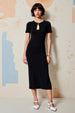 Einfaches Schwarzes Midi Hochzeitskleid mit Rundhalsausschnitt und kurzen Ärmeln