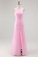 Blush Trägerloses Gerafftes Langes Brautjungfernkleid mit Schlitz