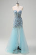 Funkelndes hellblaues Meerjungfrauen Korsett Langes perlenbesetztes Ballkleid mit Schlitz