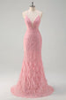 Funkelndes rosa Meerjungfrau Spaghettiträger Pailletten Langes Ballkleid mit Federn