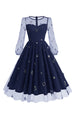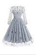 Geblümtes blaues A-Linie Kleid aus den 1950er Jahren mit langen Ärmeln