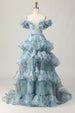Geblümtes Blaues Langes A-Linie Schulterfreies Ballkleid mit Rüschen