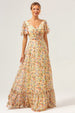 Gelbes A-Linie V-Ausschnitt Blumendruck Ballkleid mit kurzen Ärmeln
