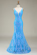 Glitzerndes blaues Meerjungfrauen Ballkleid mit tiefem V-Ausschnitt