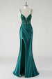 Glitzerndes dunkelgrünes Spaghettiträger Meerjungfrauen Ballkleid mit Schlitz