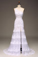 Glitzerndes dunkles marineblaues gestuftes Spitzenkleid mit einer Schulter und langem Schlitz
