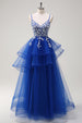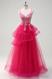 Glitzerndes fuchsia A-Linie Spaghettiträger Rüschen Langes Tüll Ballkleid mit Applikationen