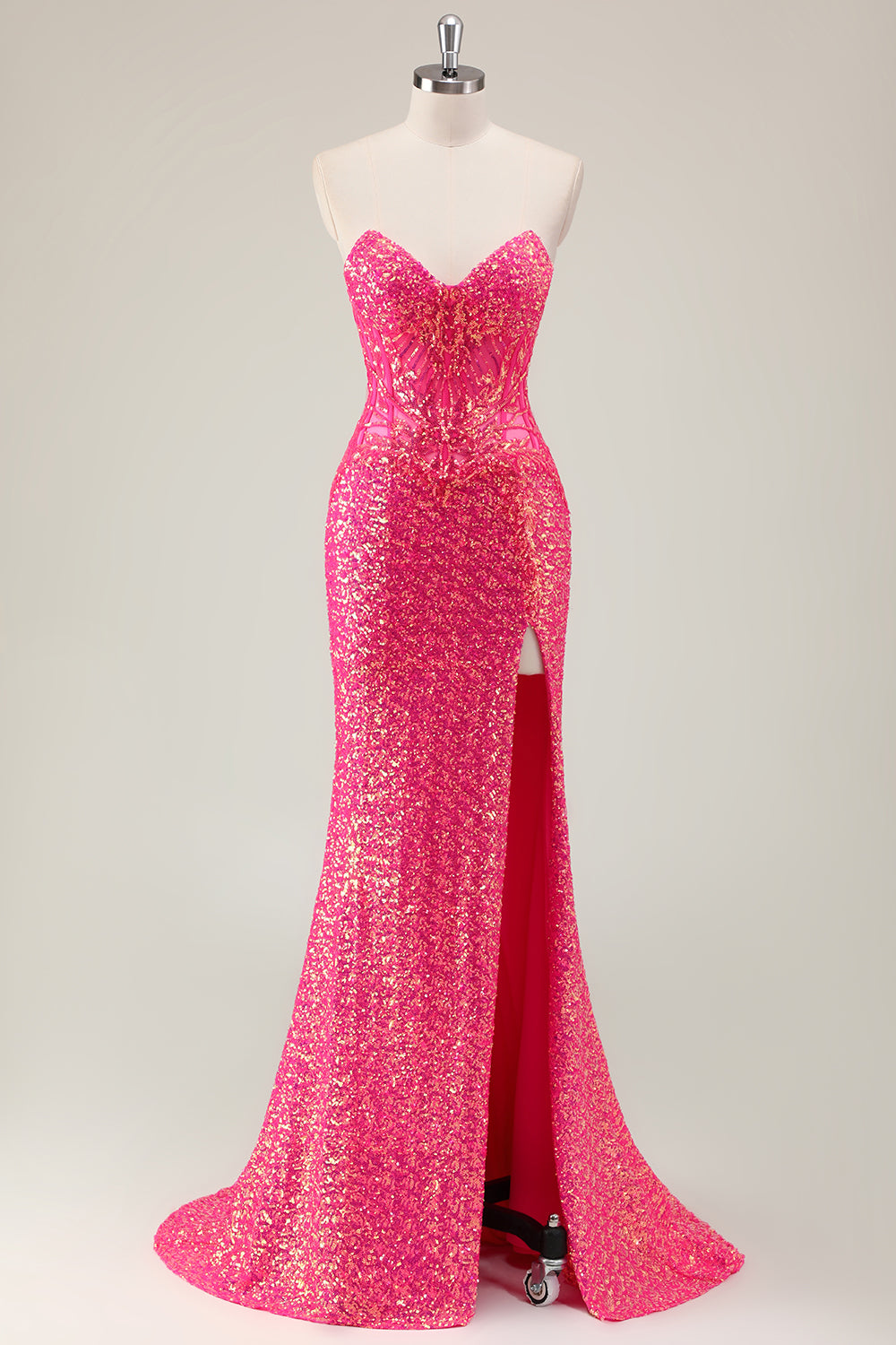 Glitzerndes fuchsia Meerjungfrauen trägerloses langes Ballkleid mit Schlitz