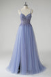 ZAPAKA Frauen Glitzerndes Graublaues A-Linie Tüll Ballkleid mit Schlitz Spaghettiträger Perlenbesetztes Abendkleid