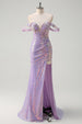 Glitzerndes hellviolettes Meerjungfrauen schulterfreies Pailletten Ballkleid mit Schlitz