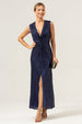 Glitzerndes marineblaues Teelanges Etui Pailletten V-Ausschnitt Ballkleid mit Schlitz