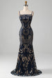 Glitzerndes marineblaues Spaghettiträger Meerjungfrauen Abschlussballkleid