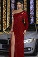 Glitzerndes rotes ausgehöhltes Meerjungfrauen Ballkleid mit Fransen und Schlitz