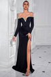 Glitzerndes Schwarzes Satin Schulterfreies Perlenbesetztes Meerjungfrauen Ballkleid mit Schlitz