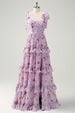 Das grau-lila A-Linie gestufte Brautjungfernkleid mit Druck und Schlitz kombiniert Eleganz und Stil.