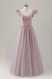 Graurosa geblümtes A-Linie Langes Ballkleid mit kurzen Ärmeln