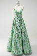Grünes glitzerndes grünes geblümtes Spaghettikleid mit Spaghettiträgern in A-Linie