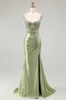 Grünes Meerjungfrauen Korsett Gerafftes Satin Ballkleid mit Schlitz