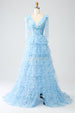 A-Linie Hellblaues gestuftes Ballkleid mit V-Ausschnitt