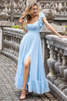 Himmelblaues A-Linie Chiffon Plissee Rüschenärmel Bodenlanges Kleid mit Schlitz