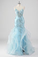 Himmelblaues Meerjungfrau Spaghettiträger Pailletten Langes Ballkleid mit Rüschen