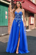 Königsblaues Tüll A-Linie Spaghettiträger Korsett Langes Ballkleid mit Schlitz