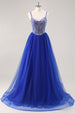 Königsblaues A-Linie Langes Ballkleid mit Perlen