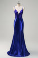 Königsblaues Meerjungfrauen V-Ausschnitt Satin Ballkleid mit Perlen und offenem Rücken