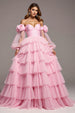 Rosa Langes Ballkleid aus Tüll mit Blumenmuster und Rüschen
