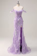 Lila schulterfreies Meerjungfrauen Langes Korsett Ballkleid mit 3D-Applikationen und Schlitz