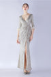 Marineblaues V-Ausschnitt Ballkleid mit Pailletten und halben Ärmeln und Federn