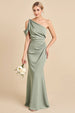 Matcha Eine Schulter Meerjungfrau Langes Satin Brautjungfernkleid